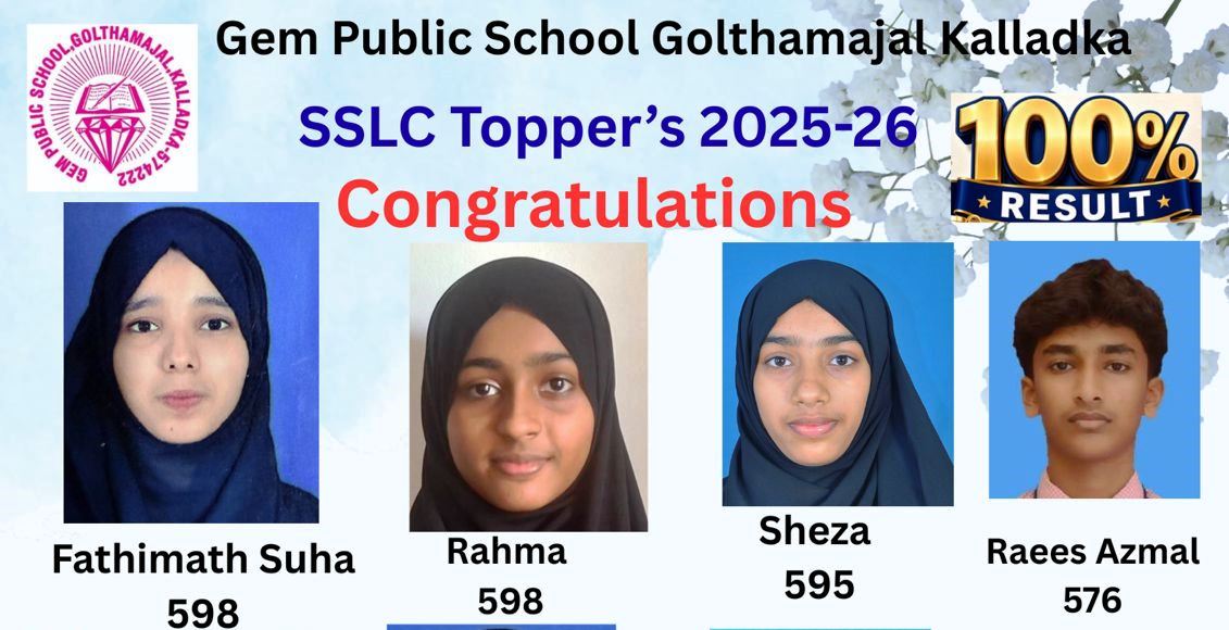 ಕಲ್ಲಡ್ಕ ಸಮೀಪದ ಗೋಳ್ತಮಜಲು ಜೆಮ್ ಪಬ್ಲಿಕ್ ಆಂಗ್ಲ ಮಾಧ್ಯಮ ಶಾಲೆ ಈ ಬಾರಿಯ ಎಸ್ಸೆಸ್ಸೆಲ್ಸಿ ಪರೀಕ್ಷೆಯಲ್ಲಿ ಶೇಕಡಾ 100 ಫಲಿತಾಂಶ ದಾಖಲಿಸಿದೆ.