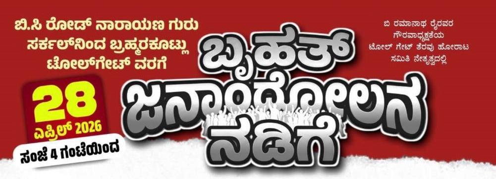 ಬಂಟ್ವಾಳ: ಬ್ರಹ್ಮರಕೂಟ್ಲು ಟೋಲ್ ಗೇಟ್ ತೆರವು ಒತ್ತಾಯಿಸಿ ಜನಾಂದೋಲನ ನಡಿಗೆ ಏಪ್ರಿಲ್ 28ರಂದು ನಡೆಯಲಿದೆ. ಸಂಜೆ 4 ಗಂಟೆಯಿಂದ ಬಿ.ಸಿ.ರೋಡಿನ ಬ್ರಹ್ಮಶ್ರೀ ನಾರಾಯಣಗುರು ವೃತ್ತದಿಂದ ಮಾಜಿ ಸಚಿವ ಬಿ.ರಮಾನಾಥ ರೈ ನೇತೃತ್ವದಲ್ಲಿ ನಡಿಗೆ ಆರಂಭಗೊಳ್ಳುವುದು. ‘