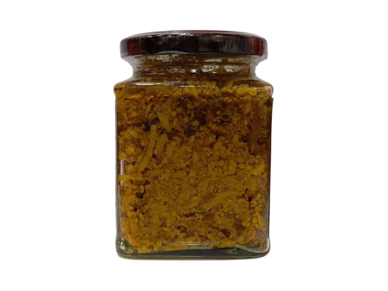 Mango Chilly Pickle Discover the Zest of Coastal Konkan with Our Mango Chili Pickle! Welcome to a world of bold and tangy flavors with our Mango Chili Pickle. It is a culinary masterpiece inspired by the vibrant traditions of Maharashtra. Immerse yourself in the unique blend of grated sour raw mangoes and the fiery kick of Green Baydgi Chilli from Karnataka. This pickle is expertly crafted with the finest ingredients. It is a symphony of taste that captures the essence of the region. Key Ingredients: Grated Sour Raw Mango: Sourced from the orchards of Sindhudurg, our raw mangoes bring a distinct sourness that perfectly balances the heat of the chilies. Green Baydgi Chilli: Known for its fiery and flavorful profile, this chili variety from Karnataka adds a delightful kick, elevating the pickle to new heights. Mustard Oil: Infused with the pungent aroma of mustard, our mustard oil provides a robust and authentic flavor that defines the traditional taste of this pickle. Sunflower Oil: Carefully added to temper the pungency of mustard oil, sunflower oil ensures a well-balanced and enjoyable culinary experience. Traditional Spices: A secret blend of time-honored spices enhances the complexity of flavors, offering a unique and unforgettable taste. Mustard Dal: Elevating the texture and taste, mustard dal adds a delightful crunch to each bite, creating a sensory delight. What Sets Our Mango Chili Pickle Apart? Perfect Harmony of Flavors: The marriage of sour mangoes and Green Baydgi Chilli creates a harmonious dance of tanginess and heat, making each bite an explosion of taste. Dual Oil Infusion: Our unique combination of mustard oil and sunflower oil brings a balance of intense flavor from mustard and a milder note from sunflower, ensuring a pleasant experience for your palate. Crunchy Texture: The addition of mustard dal not only adds to the flavor but also introduces a delightful crunch, making this pickle a sensorial adventure. Crafted with Tradition: Rooted in Maharashtra’s culinary heritage, our Mango Chili Pickle is a celebration of traditional recipes passed down through generations Ways to Savor the Spice: Accompaniment: Pair it with your favorite Indian meals, from rice dishes to dosas, for an extra kick of flavor. Creative Cooking: Use it as a flavorful ingredient in wraps, sandwiches, or even as a topping for pizzas to elevate your culinary creations. Added to Glass of buttermilk. It makes a wonderful tasty, hot & spicy Masala Chhach ( buttermilk ) Immerse Yourself in Coastal Culinary Riches: Our Mango Chili Pickle is more than a condiment; it’s a journey through the rich tapestry of Maharashtra’s gastronomic legacy. Every jar is a testament to our commitment to authenticity, flavor, and quality. Spice up your meals with the bold and vibrant taste of Konkan. Order your jar today and embark on a flavorful adventure! Ingredients Grated Raw Mango Baydagi Chilli Traditional Mixed Spices Turmeric Asafoetida Sea Salt Mustard Oil Sunflower Oil