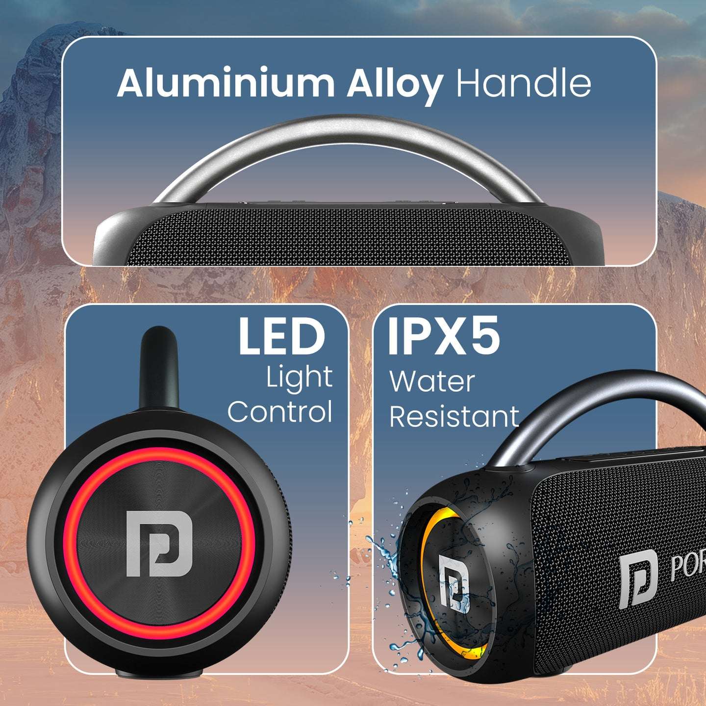 POWERFUL 30W SPEAKER : Portronics Radiant is a 30-watt speaker that provides a powerful music experience. Made in a premium design and with the latest technology, his speaker is engineered to deliver rich, immersive sound, in every location. MULTICOLOUR LED LIGHTS : Immerse yourself in a captivating audio-visual experience with our speaker’s RGB LED lights that groove to your music. It transforms any space into a dynamic dance floor and makes everything come alive with lights. TWS CONNECTIVITY : Double the audio impact with the speaker’s TWS connectivity feature, allowing you to pair two Radiants wirelessly for a powerful 60 watts of crystal-clear sound. Perfect sound for both indoor and outdoor parties HANDS-FREE CALLING : No need to reach for your phone every time you get a call, as the speaker has a built-in microphone for the ultimate convenience of hands-free calling. Now you can answer calls and manage your music playback with a simple button press. LONG PLAYTIME & RECHARGEABLE : Enjoy non-stop music for up to 6 hours on a single charge thanks to the powerful 1,800 mAh battery. Charge conveniently with the Type-C port, making it your perfect companion for hiking, traveling, or extended outdoor activities. ALUMINIUM HANDLE & IPX5 : With a firm aluminium alloy handle, this portable speaker can be carried anywhere. Its IPX5 water resistance makes it splash, rain, and spray-resistant, perfect for outdoor activities like camping, beach outings, and more. WIRELESS KARAOKE MIC : Enjoy crystal-clear sound with the included wireless Karaoke Mic, perfect for karaoke nights, parties, or family gatherings. Importer/Manufacturer/Packer – Portronics Digital Private Limited, Ground Floor and First Floor, Property No. D 8 Upper Basement, Sector 8, Noida, Gautam Buddha Nagar, Uttar Pradesh, 201301