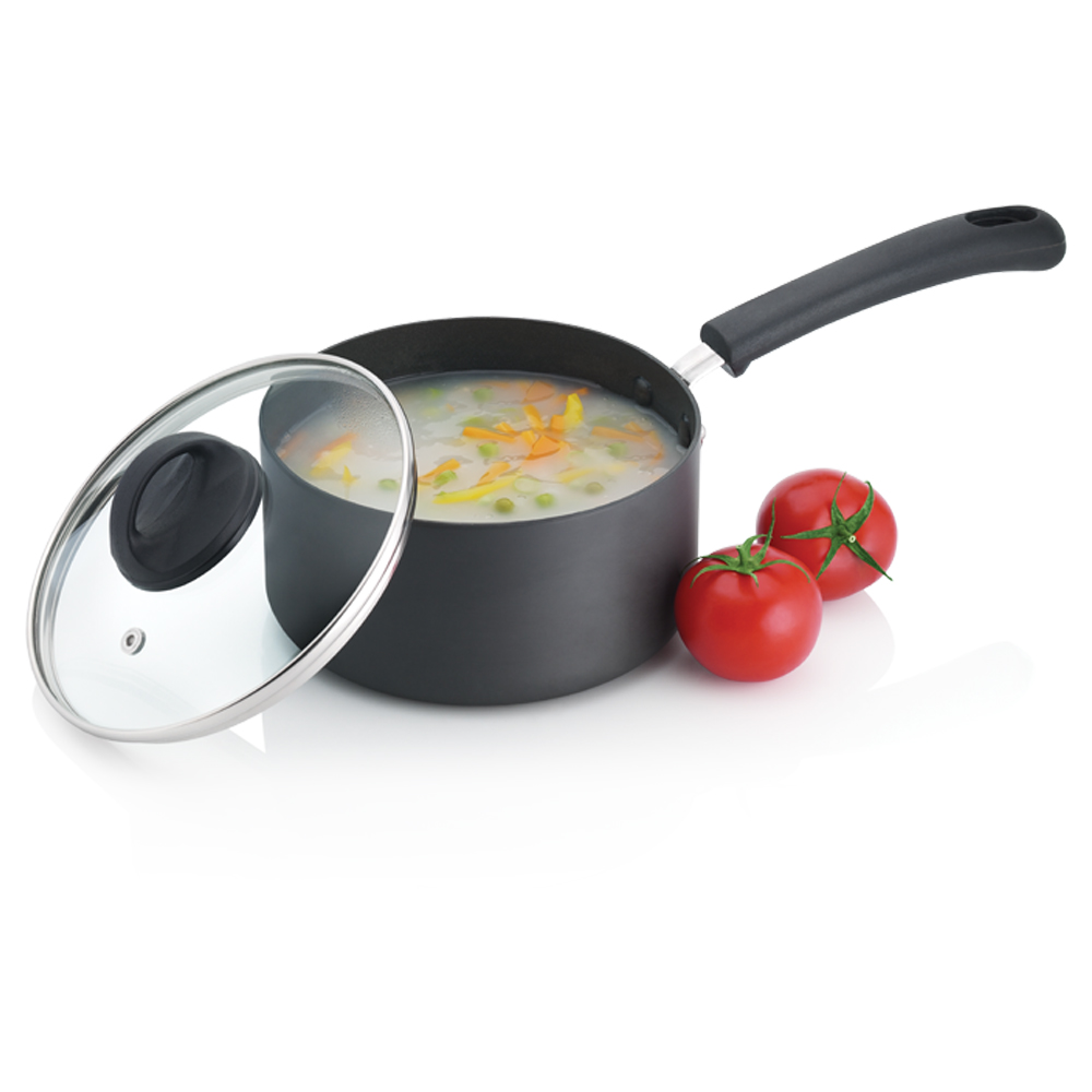 Premier Trendy Black Hard Anodized Sauce Pan with Glass Lid is stylish and hygienic to cook, Safe, Reliable and long lasting. Hard Anodized Advantages: Extra Hard – The outstanding feature of this kind of cookware is very durable. By anodized aluminum, it’s scratch resistant ‐no chip or peel easily. In fact, it’s twice harder than alloy like stainless steel. Non-Toxic Nonstick – The smooth surface is from electro-chemical anodized process which creates layers of non-stick Non-Reactive – The aluminum inside for preventing aluminum leaching possibility when cooking acidic food like tomato sauces or lemon juices High Cooking Performance – The whole aluminum building, it unsurprisingly conducts heat very fast and evenly. The ability of heat conductivity is inferior to pure aluminum. Easy to Clean – As smoothly non-stick, hard-anodized products are very easy to clean