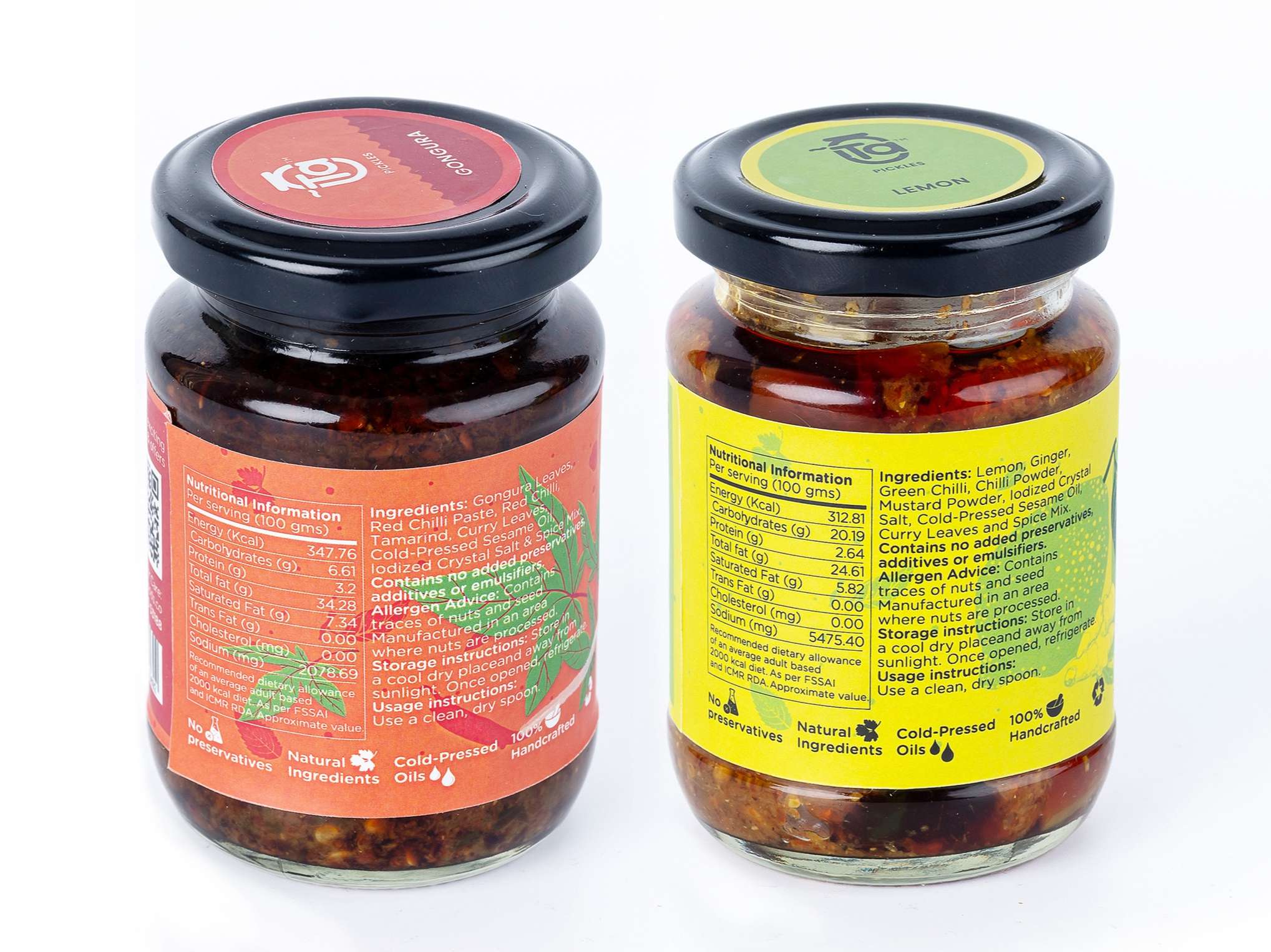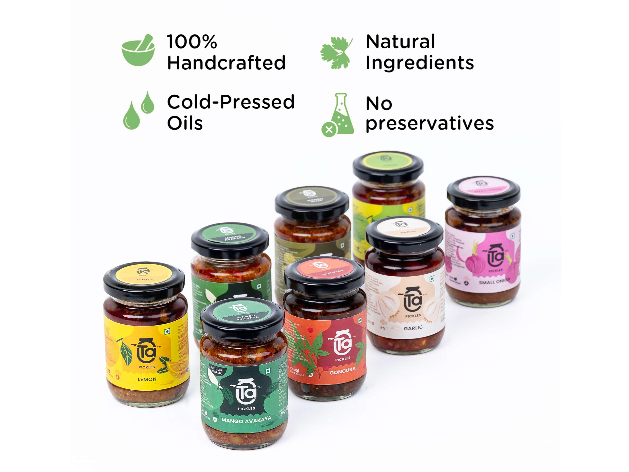 Combo of 2 150 g Ta pickles made with 100% cold pressed oils and free from preservatives.