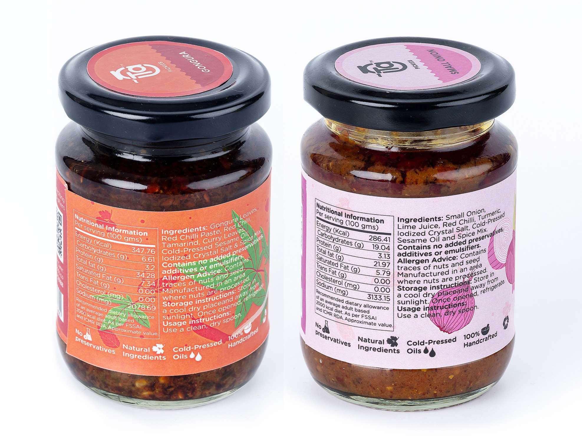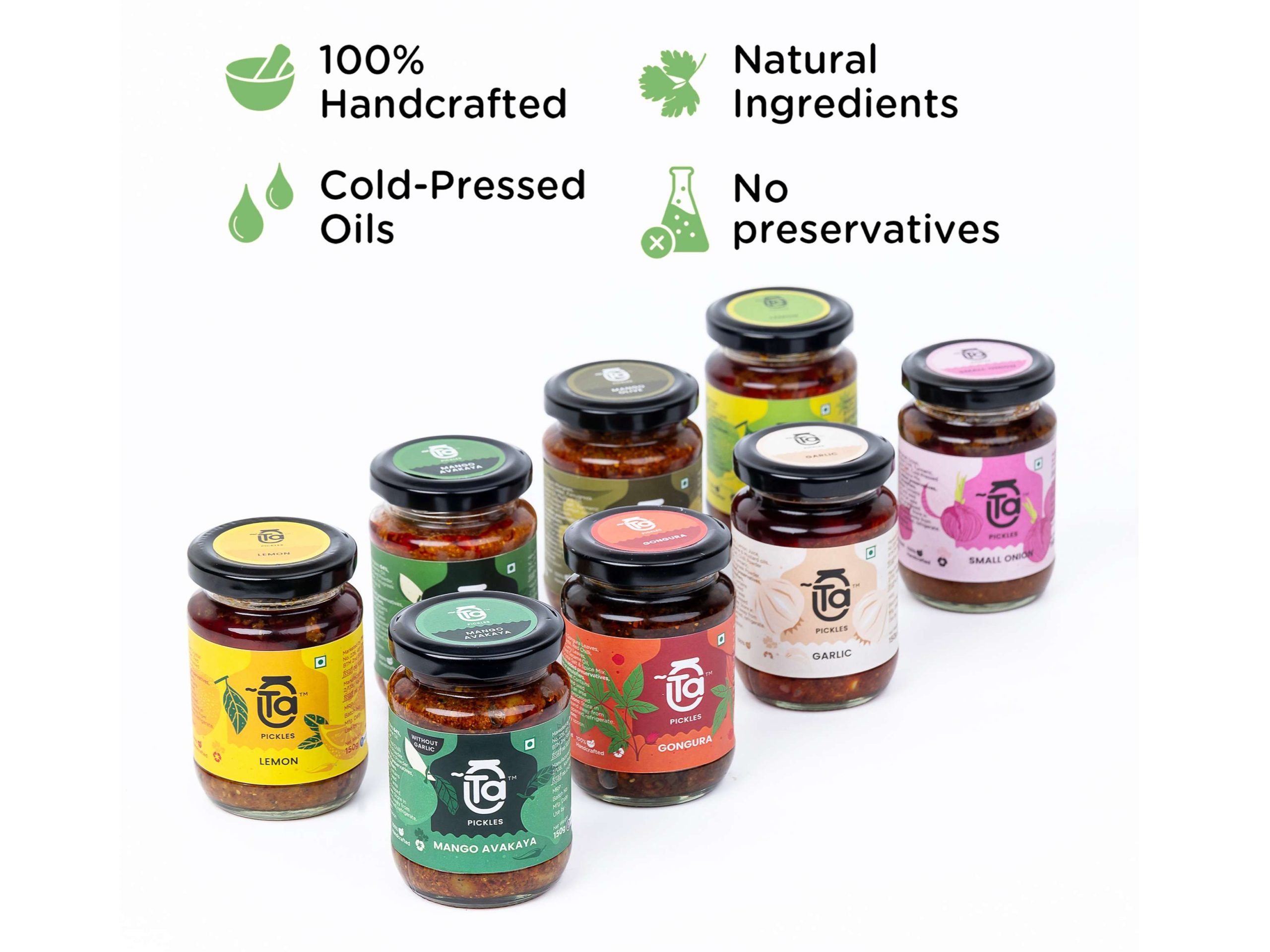Combo of 2 150 g Ta pickles made with 100% cold pressed oils and free from preservatives.