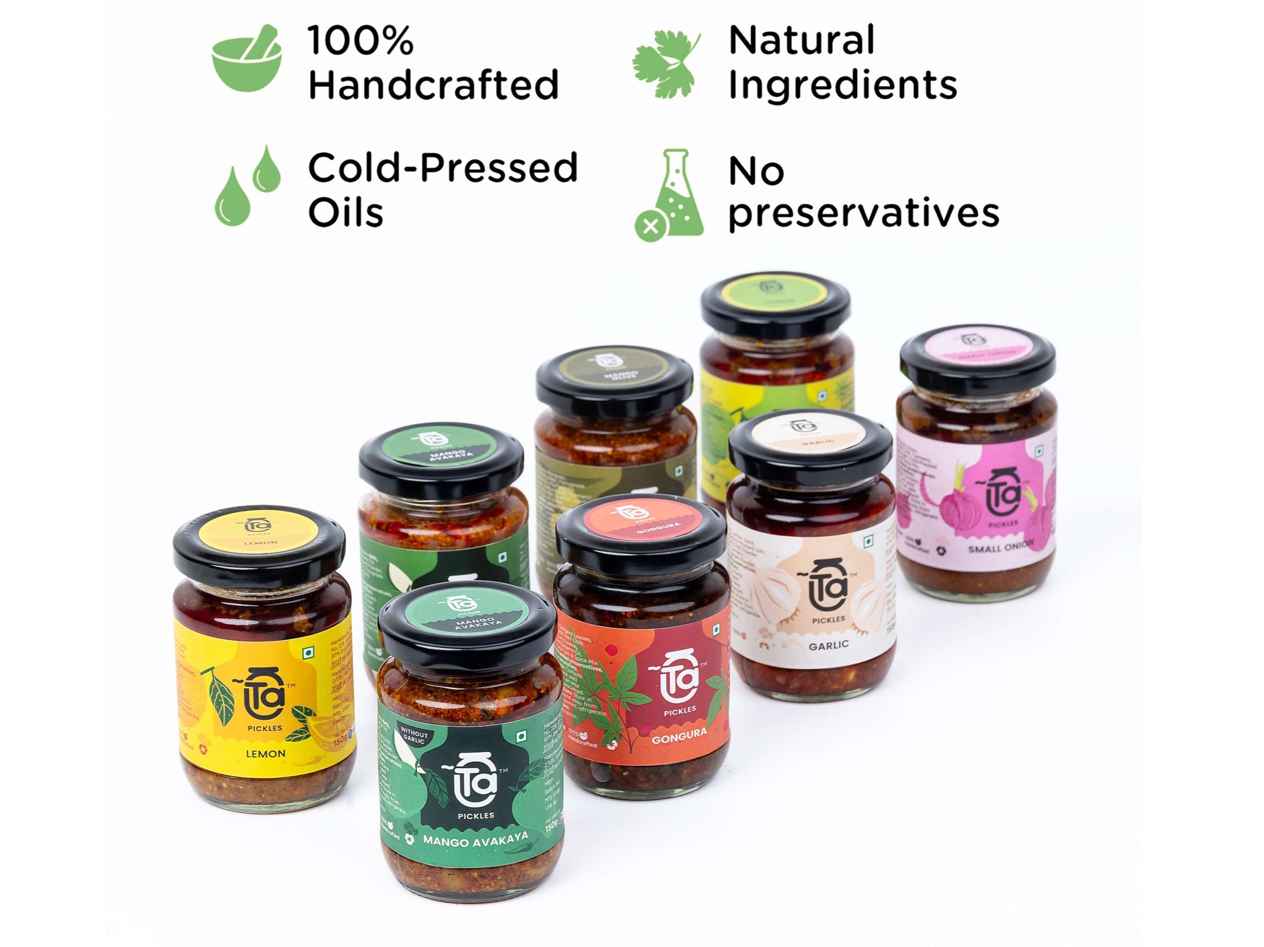 Combo of 2 150 g Ta pickles made with 100% cold pressed oils and free from preservatives.