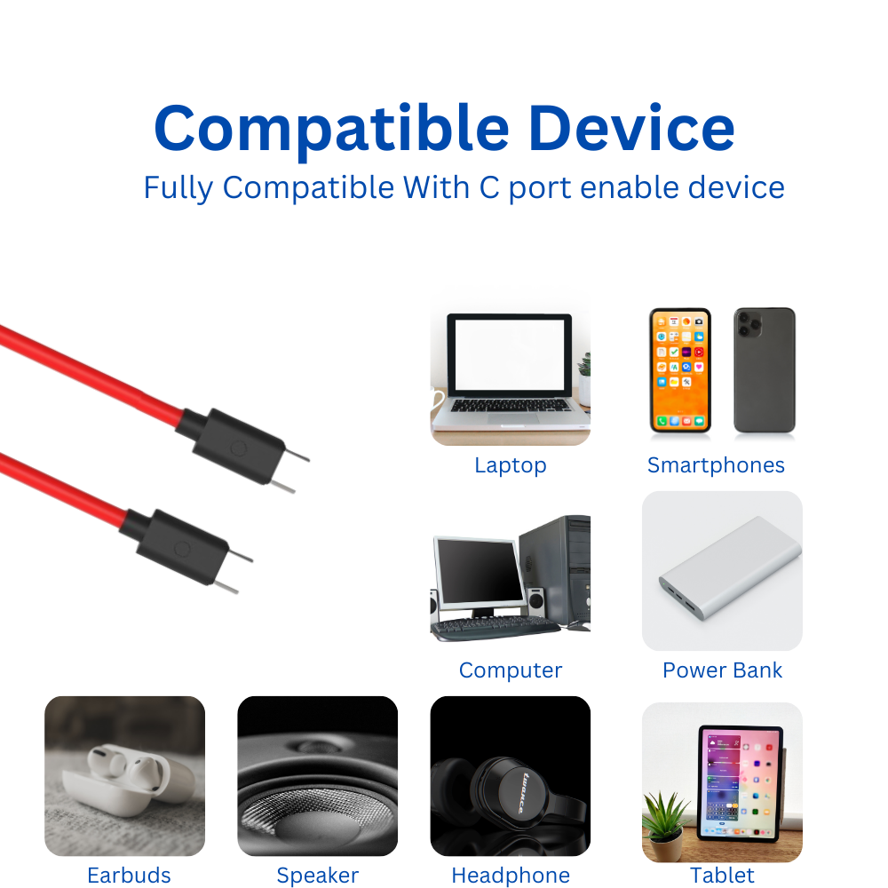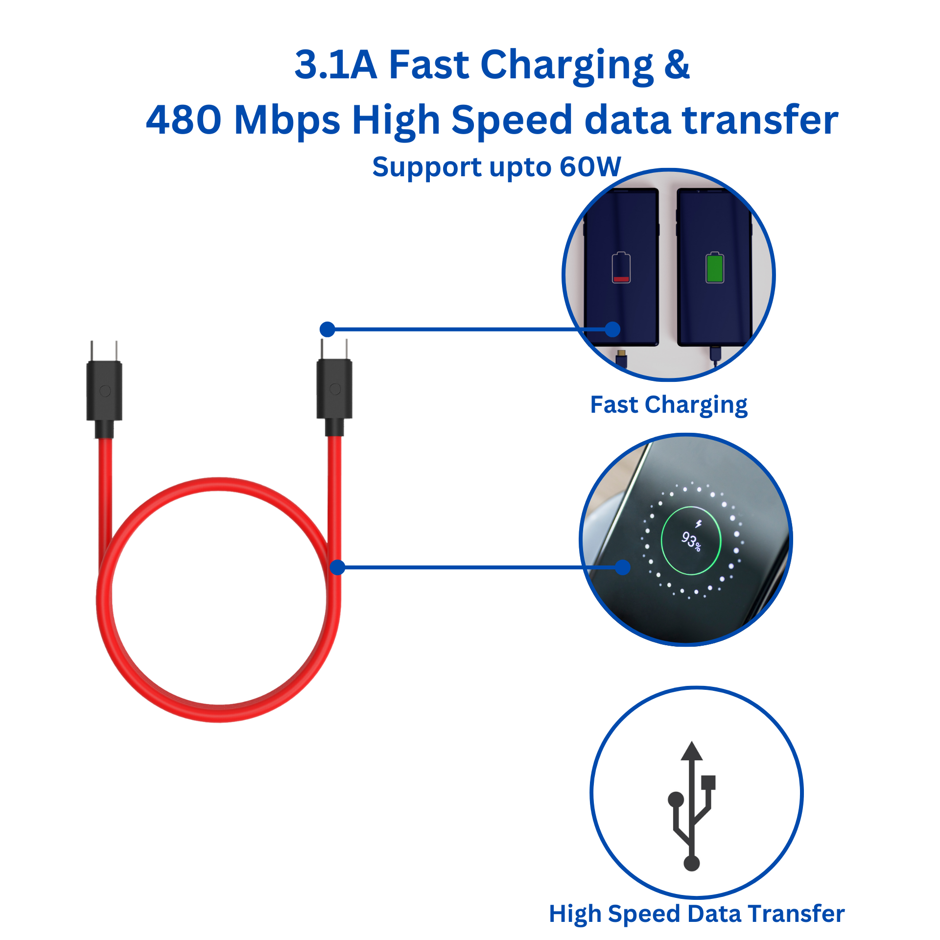 Twance TC23R PVC – Type C to Type C fast charging and data transfer Cable, 0.25 Meter Length, Red color, Fast Charging , 3.1A, High speed data transfer 480mbps, 6 months warranty, Suitable for all android smartphones, Laptop, tablet, power bank, any other with C port enable device, Make in India