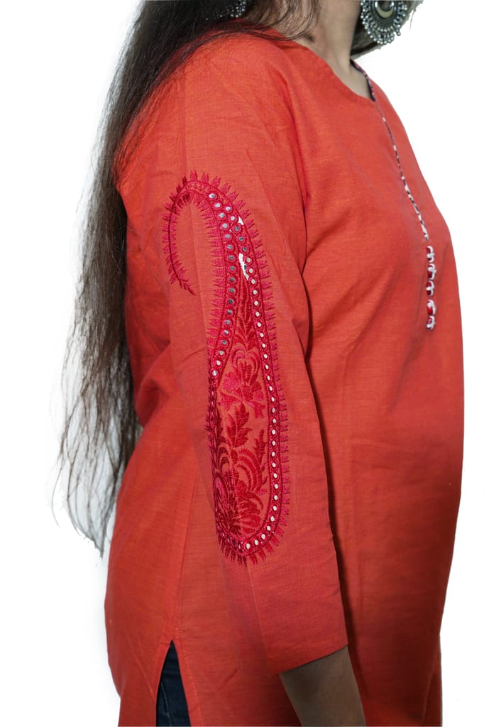 Be the first to comment on "Women’s pure cotton straight rust orange color embellished kurta"